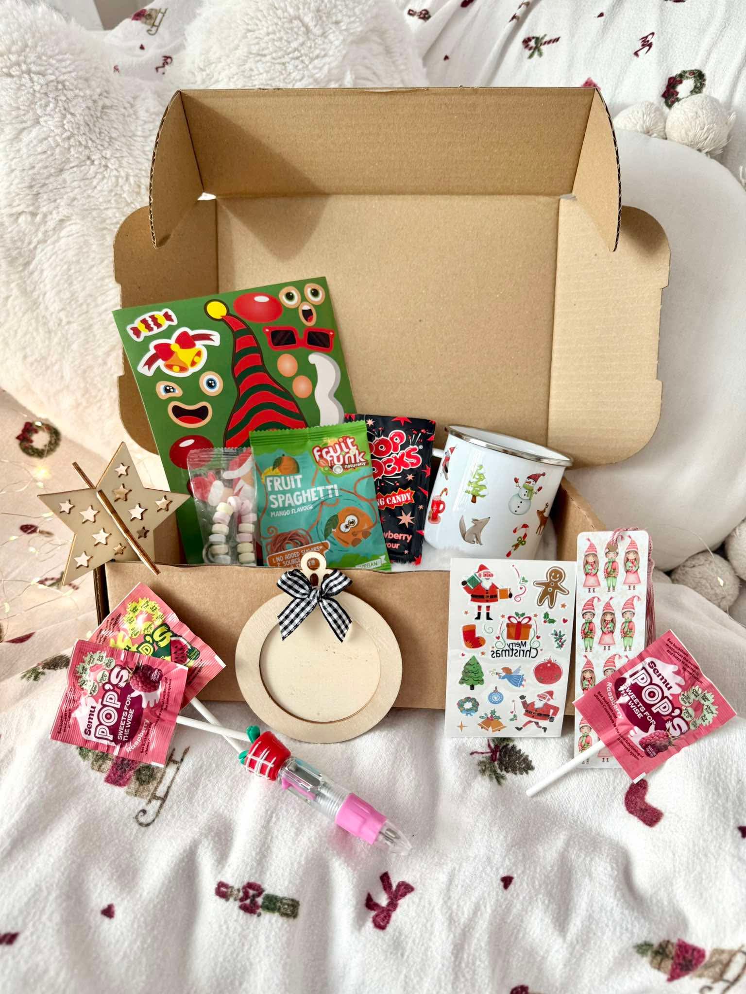 Pole personaalseid nimesid ega kirju, kuid rõõmu ja üllatusi jagub igasse detsembripäeva! Pakist leiab nii lemmikmaiuseid (M&M’s, Pop Rocks, Haribo, Mini Nutella, Prezelid, kõrrejook) kui ka vahvaid tegevusi ja meisterdamist (jõulutätoveeringud, kleebisleht, järjehoidja, jõulutäht, kuuseehted, kuuseehtest pildiraam). Lisaks ka midagi eriliselt praktilist – jõulutass, millest saab igal hommikul sooja kakaod juua.