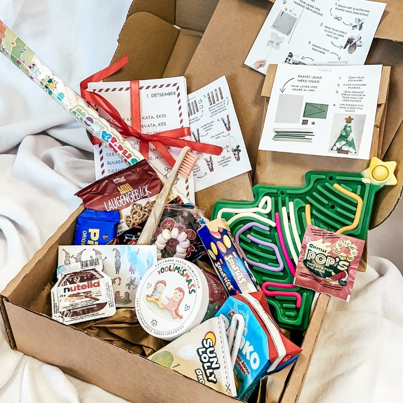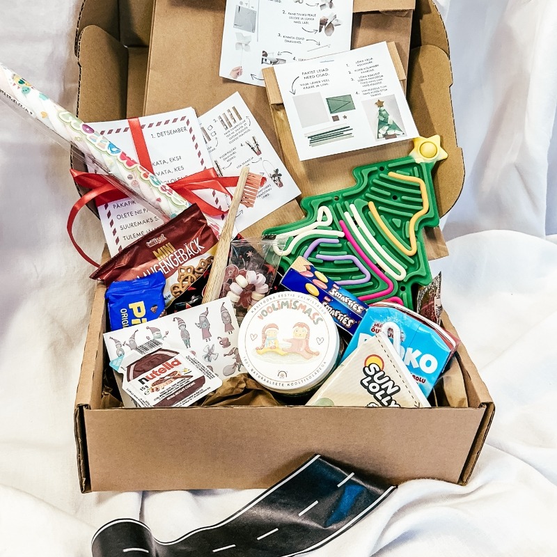 12 maiustust või soolast snäkki ning 12 loovaks tegevuseks või mängimiseks mõeldud eset. Pakid sisaldavad ka personaalseid kingitusi lapse nimega. Oleme pakendanud kõik ilusasse karpi, kust on hommikul kiire ja mugav üllatus sussi sisse pista!