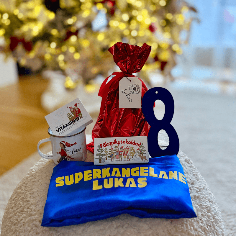 Väikese superkangelase kingipakk on mänguline ja südamlik jõulukink, mis toob lapsele korraga nii ägeda rollimängukostüümi, isikliku joogitassi kui väikesed magusad ampsud. Nimeline superkangelase kostüüm saab kohe selga tõmmata, nimelise tassi saab täita lapse lemmikjoogiga ning päkapikušokolaad koos hea tuju vitamiinidega panevad silmad rõõmust särama.